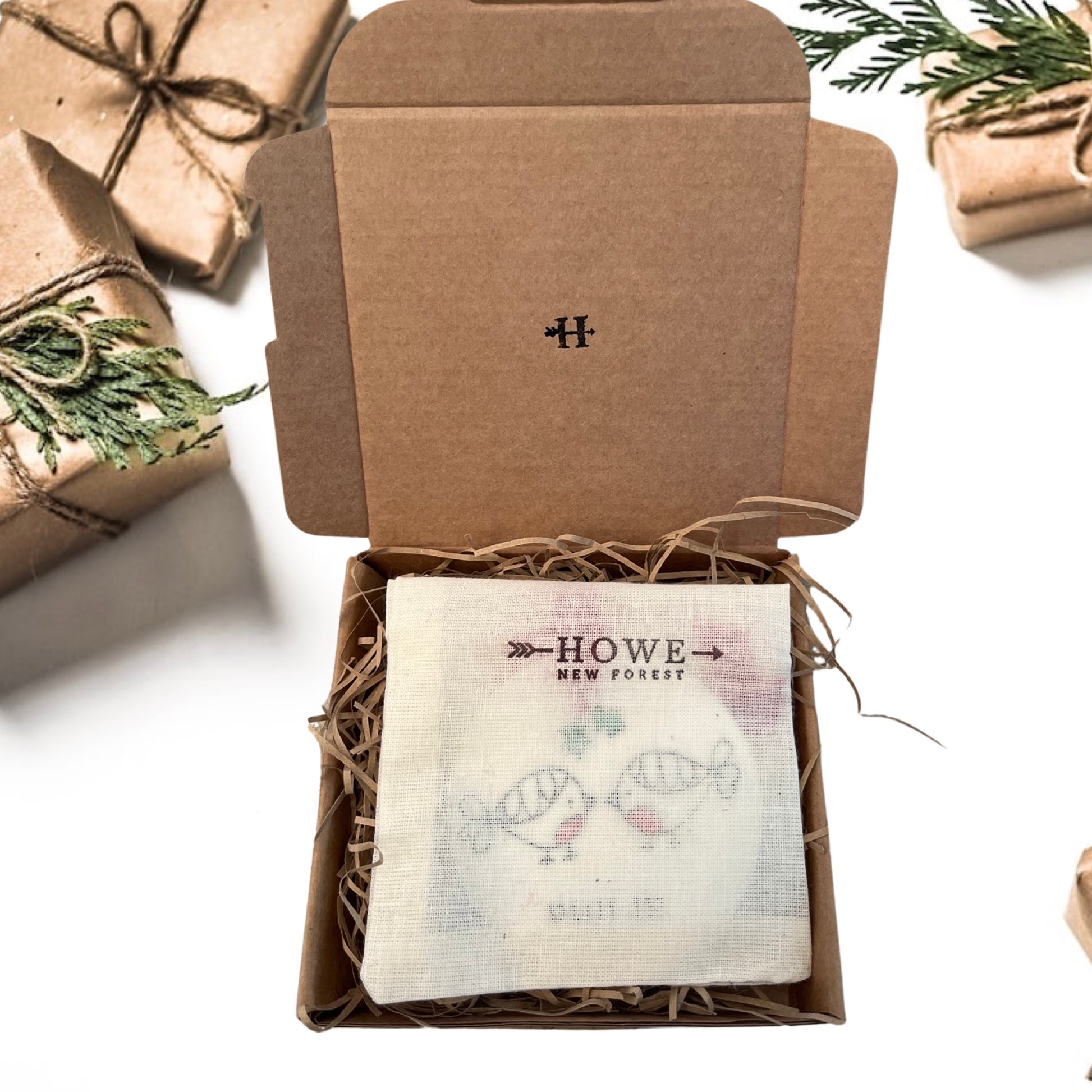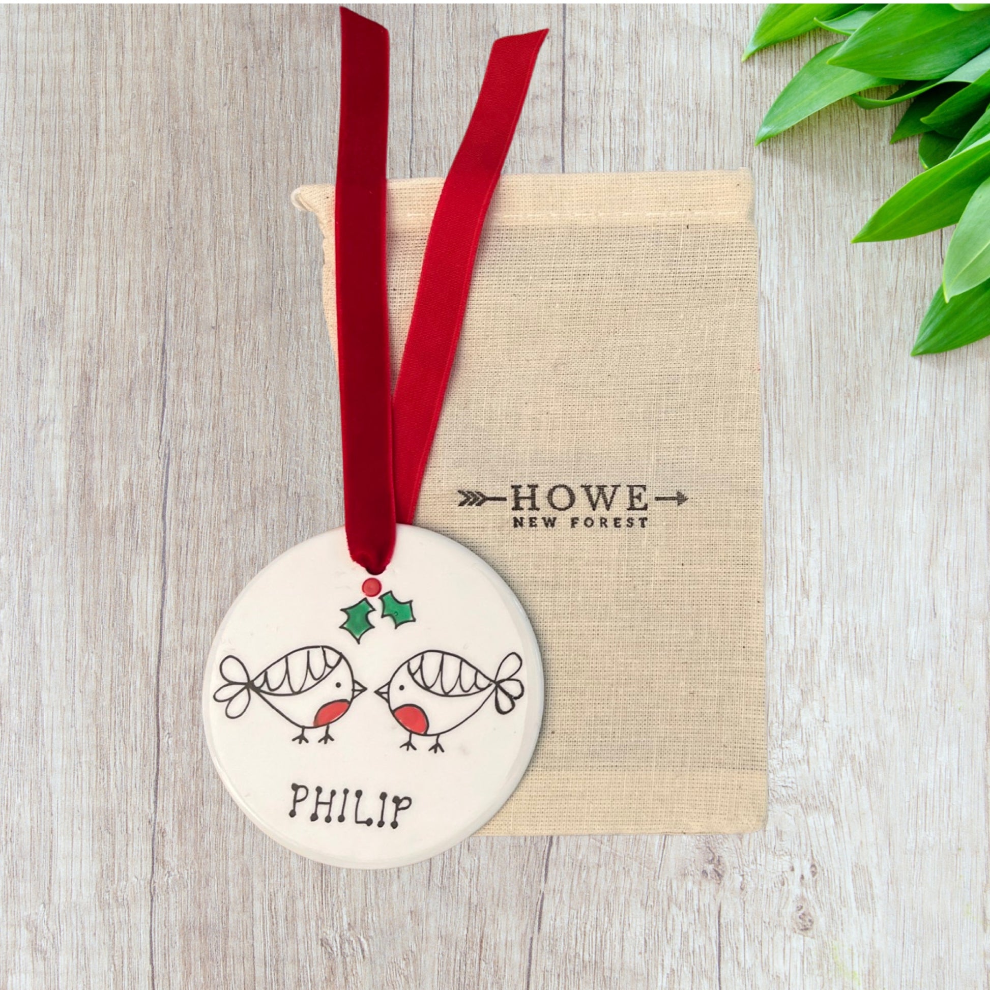 Flat, glazed bauble, 8cm diameter. Hand painted pair of robins under mistletoe with your choice of name, 2025 on reverse. Velvet ribbon for hanging. Presented in a cotton drawstring bag, all packaging recyclable.