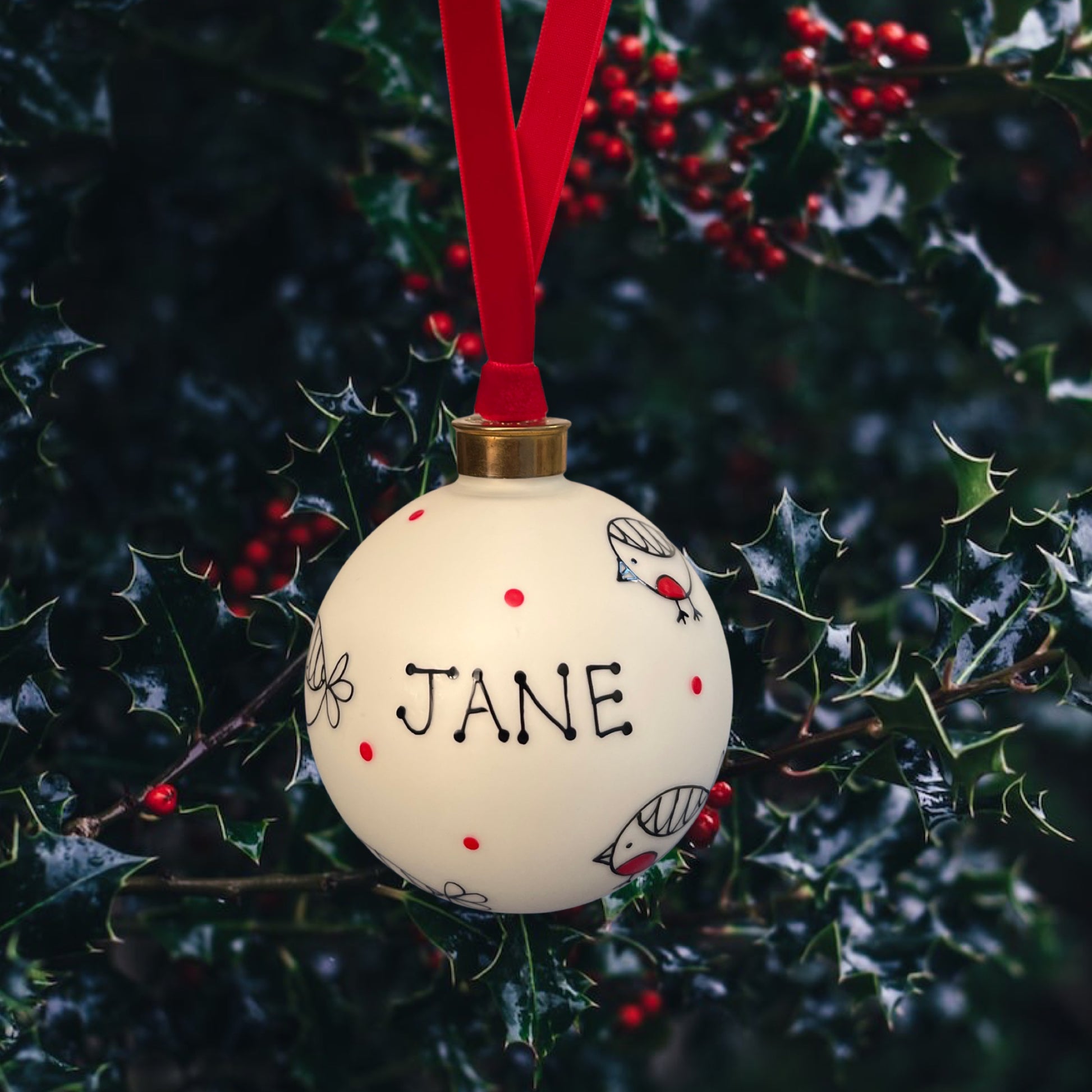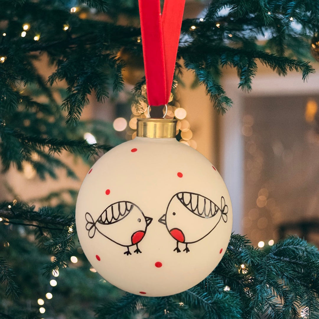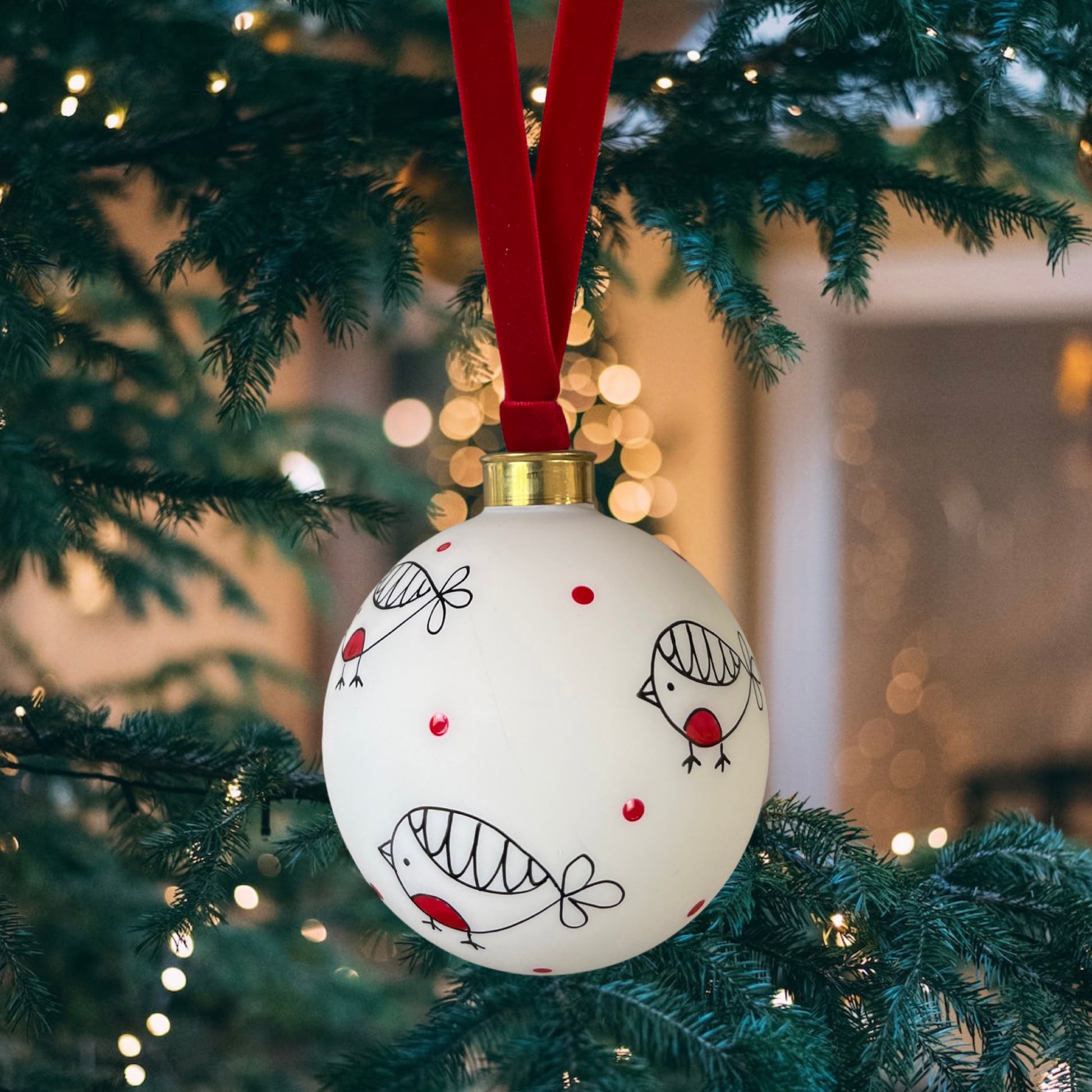 White glass bauble, 8cm diameter. Hand painted robins on 8cm white glass bauble. Velvet ribbon to hang.