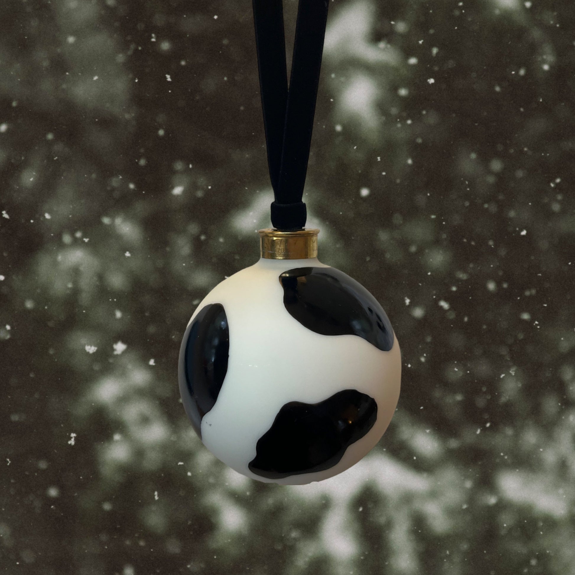 Hand painted cow print. White glass bauble, 8cm diameter. Velvet ribbon to hang.