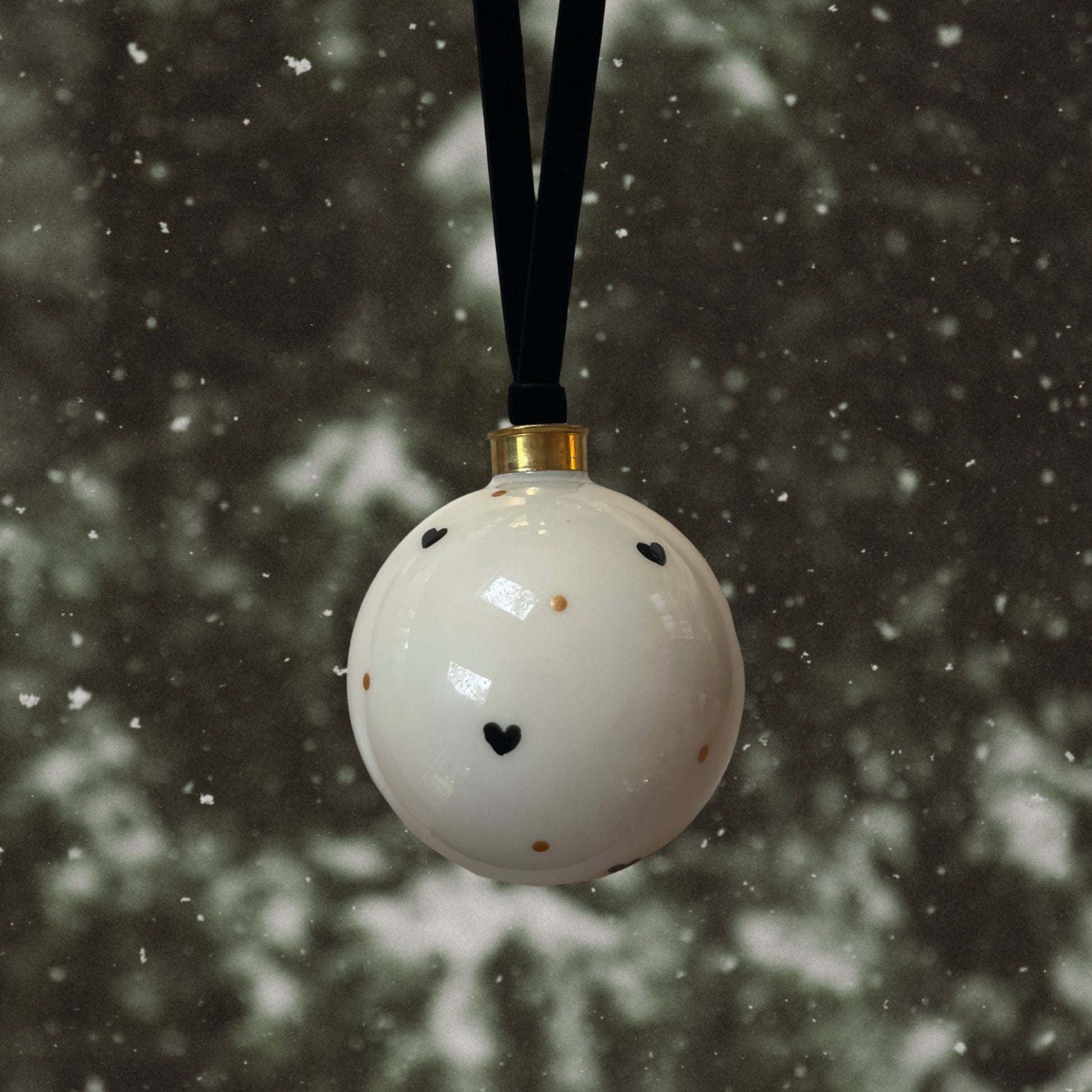 Hand painted black hearts & gold spots. White glass bauble, 8cm diameter. Velvet ribbon to hang.