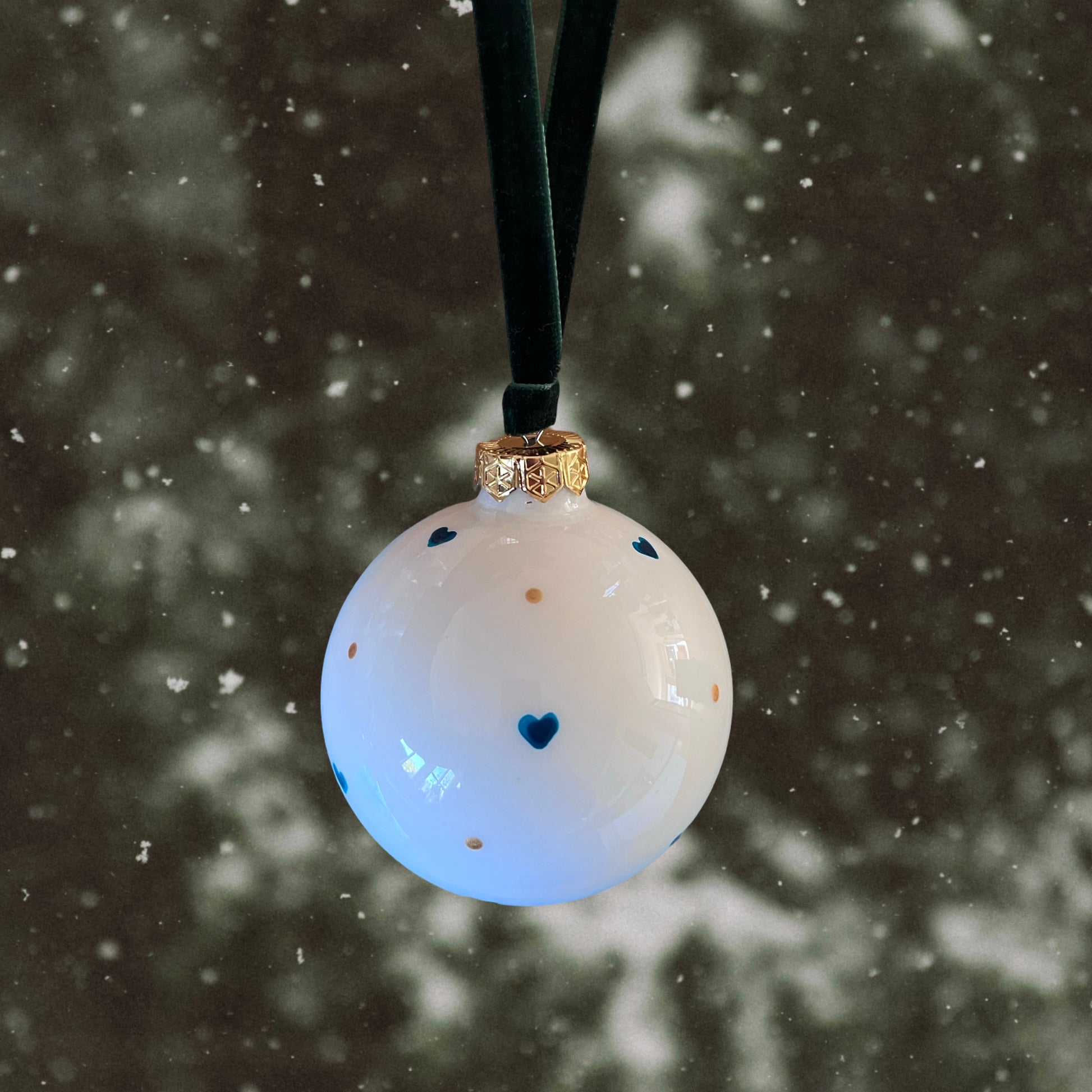 Hand painted teal hearts & gold spots. White glass bauble, 8cm diameter. Velvet ribbon to hang.
