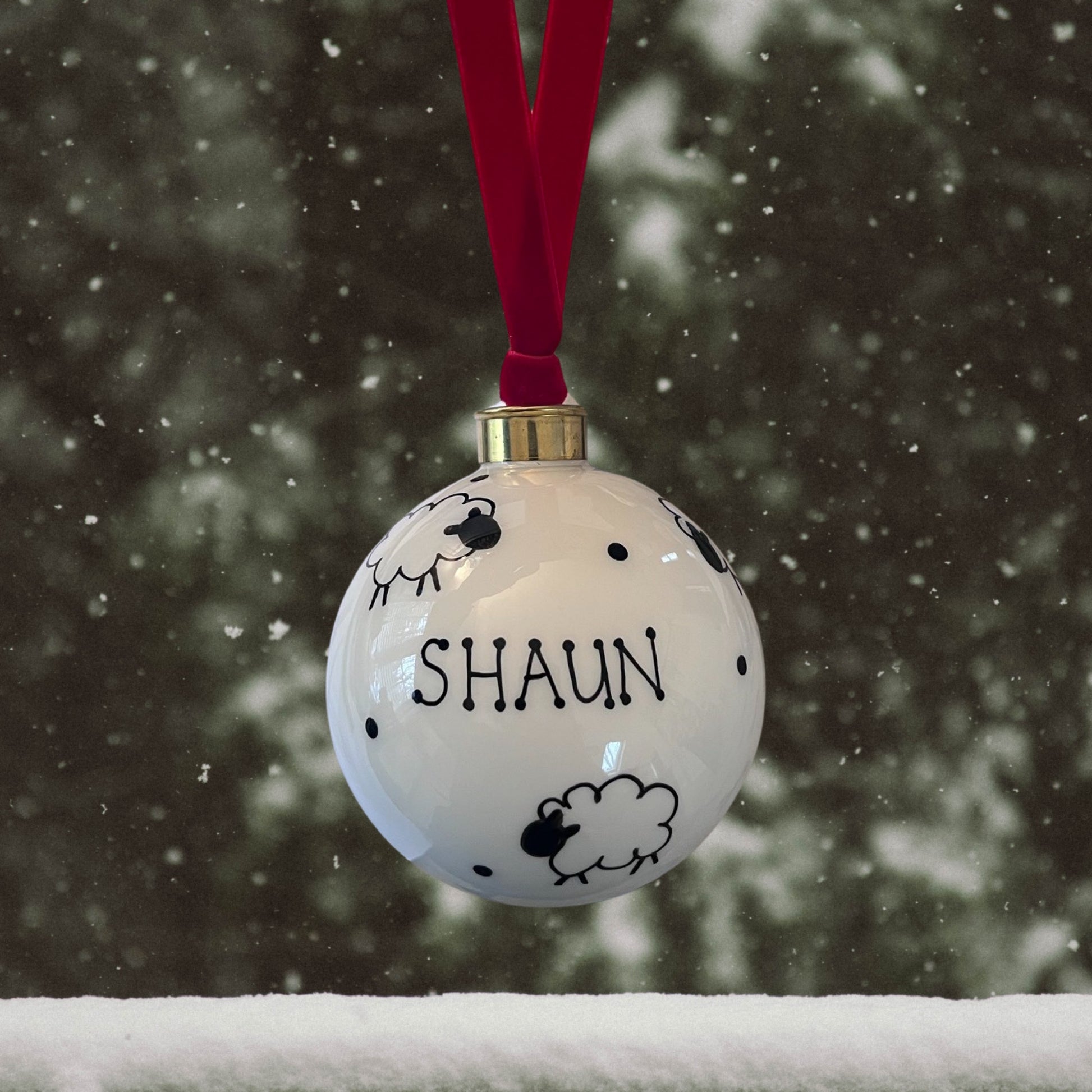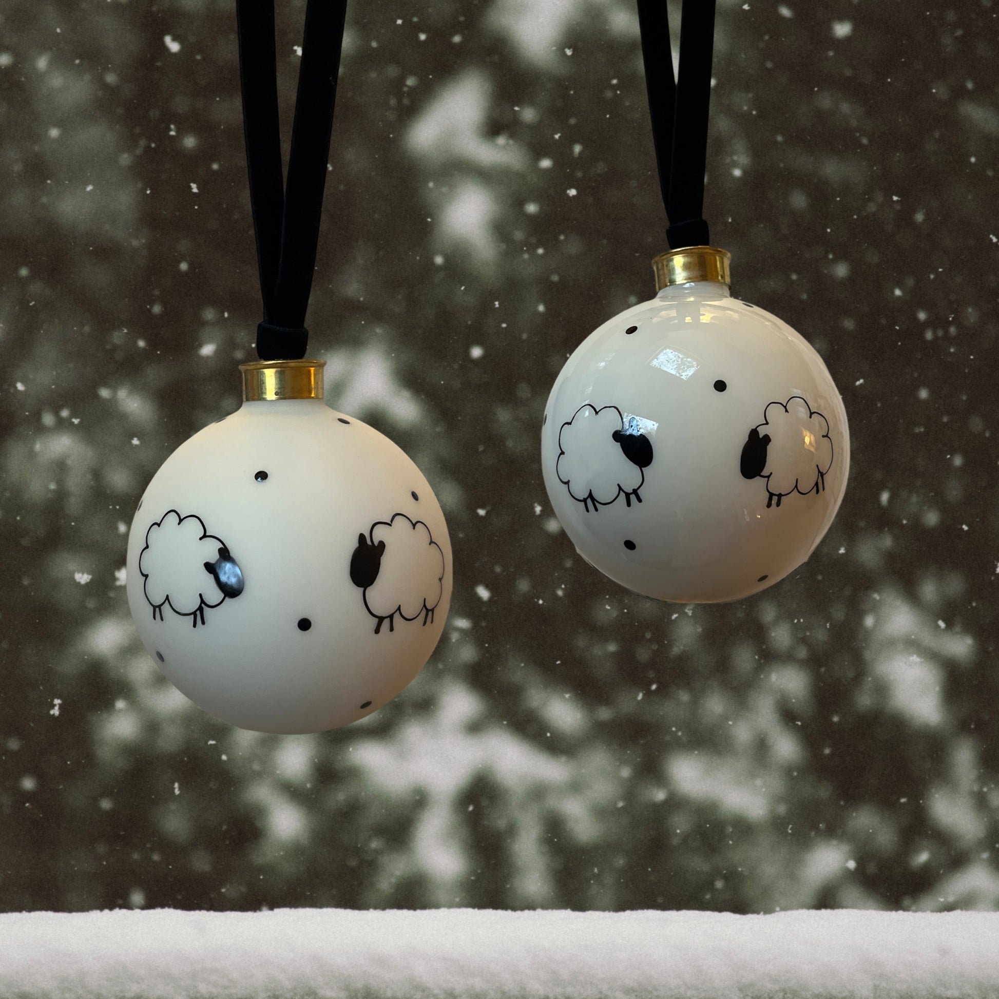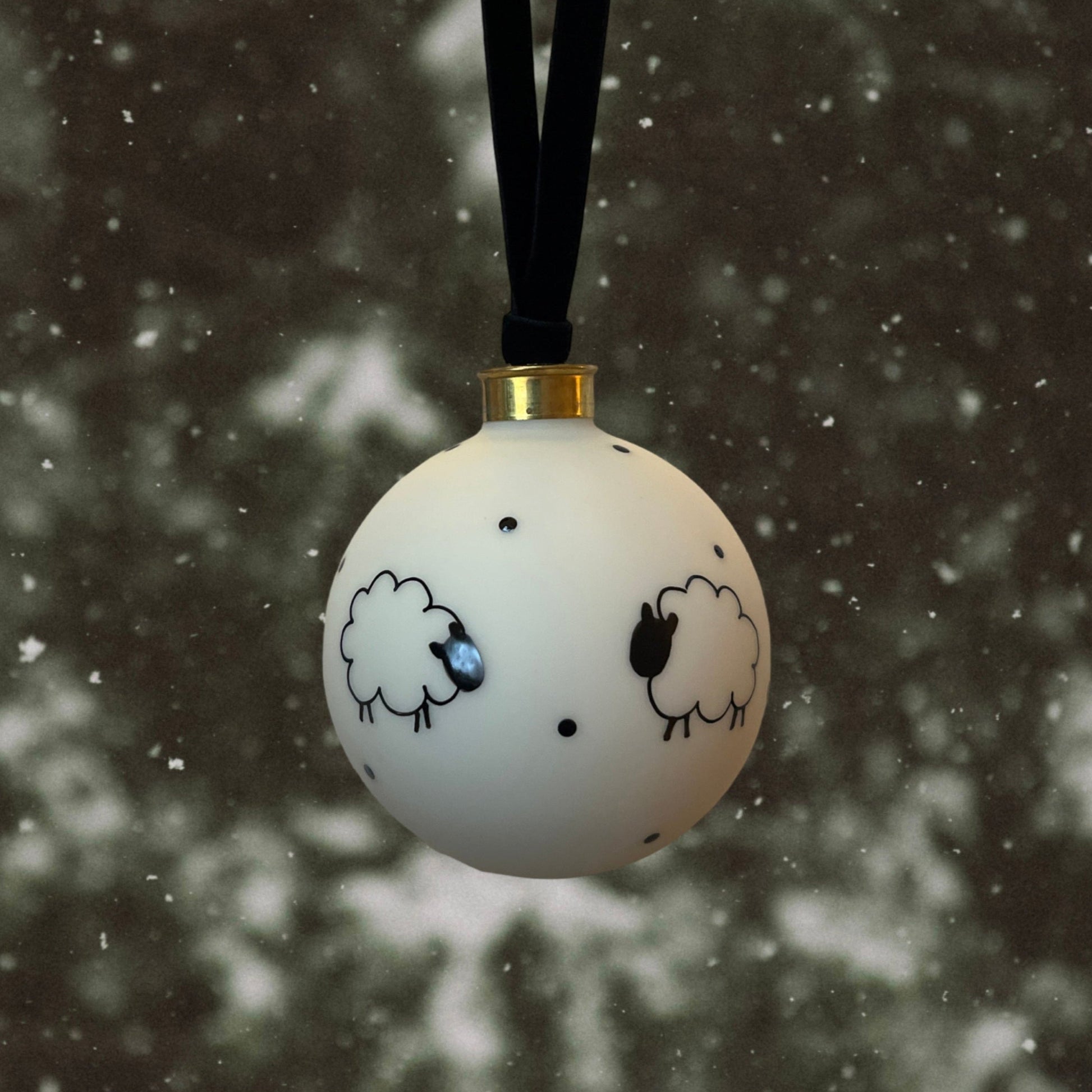 Hand painted sheep. White glass bauble, 8cm diameter. Velvet ribbon to hang.