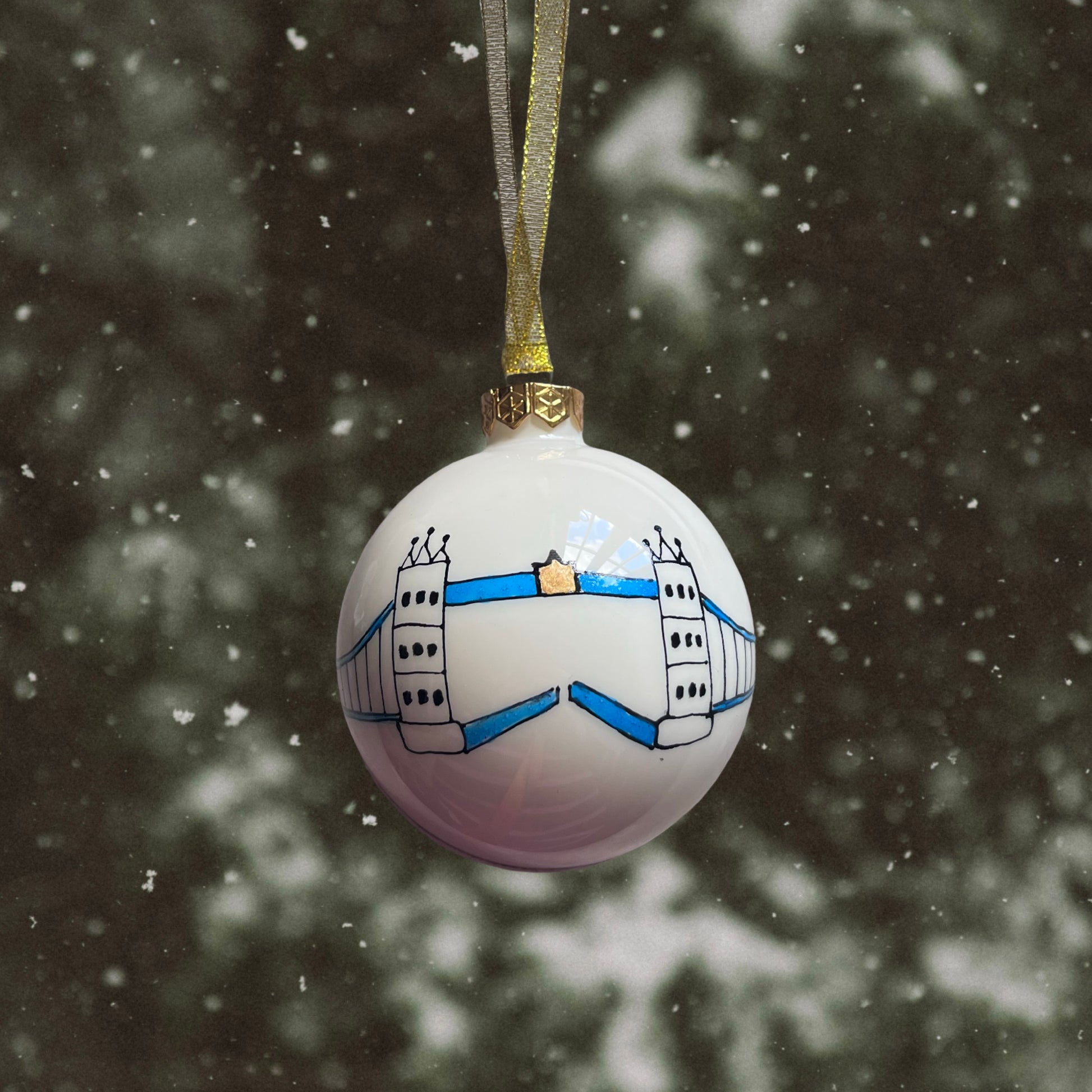 Hand painted Tower Bridge illustration on white glass bauble, 8cm diameter. Gold ribbon to hang.
