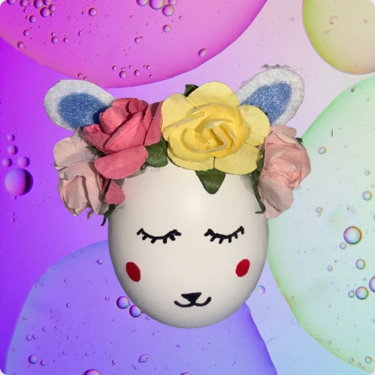 Individually painted wooden eggs with velvet ears, flower decoration and hand painted detailing.